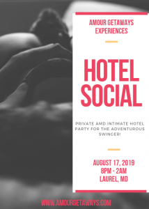 Amour Getaways Hotel Socials are private and intimate hotel parties for the adventurous swinger. This event is about connecting with other couples in the lifestyle, getting comfortable with yourself and people around you. Expect to have fun at the party, meet new people and if something happens with others, enjoy it!